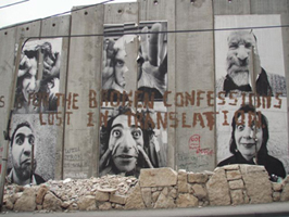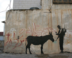 でも、ひとつだけ言えることがある。自信はないが、なんか想像できる。今、隔離壁は世界一、ヒップなキャンパスなのではないか、と。BANKSYをはじめ、世界中のグラフティ・アーチストがベツレヘムのパレスチナ人隔離壁にグラフティを描いたり、ポスターを貼りまくっている。(→写真)それを目当てに観光客がだんだんと集まってきているらしい。これはいいチャンスではないか!隔離壁を世界が注目する観光地にでっちあげる企みに微力ながらも連帯して、国際的な世論ってやつにこの問題をジャッジしてもらうように仕向けよう。そうしたら僕が悩む必要もなくなるし。