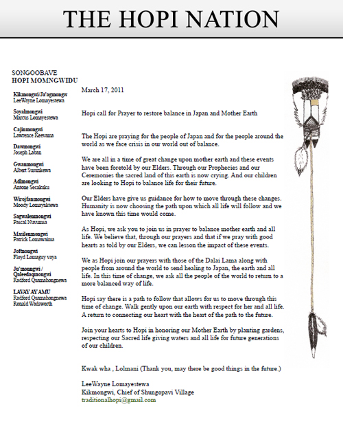 「ホピは日本と母なる地球のバランスを回復するための祈りへの参加を求める」