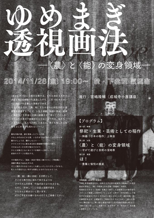 そこで私たちは、〈農/能〉をなかだちに前近代的な諸価値を透視することで、人生と演劇、物語と歴史、経済と芸術などを手当り次第に結婚させてゆくことに した。それらの交差点で結婚式をとりおこなう今日、私たち はあらたに「私たちの時」とまみえ、畏くも愉しみな交際をはじめるかも知れない――。》