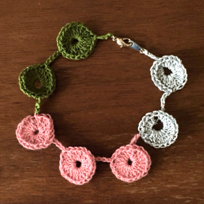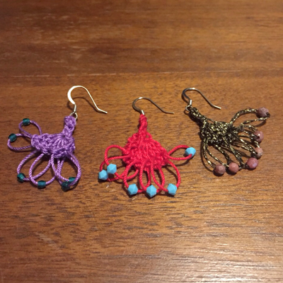 今回は、かぎ針を使って好きな色の糸を選んで、編んでブレスレットやピアスをつくります。