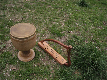 中世のハープ、プサルテリを爪弾くSallyとペルシャのトンバク、ダフをたたくLeoの中世古楽デュオ。